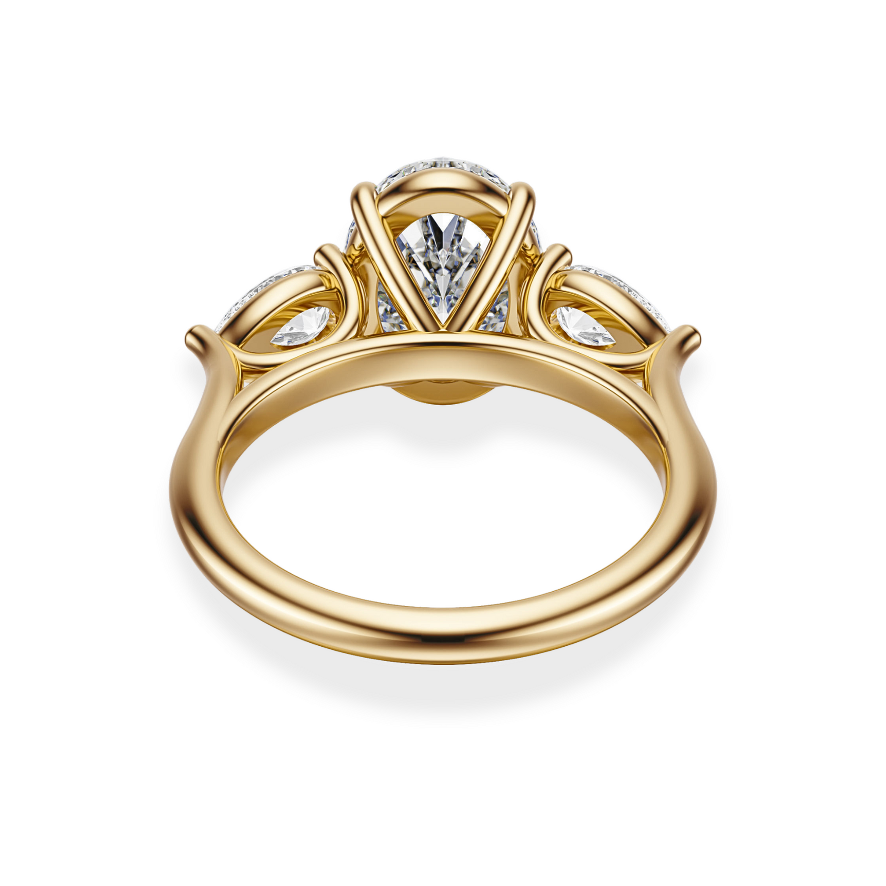 The Aurora is a celebration of timeless beauty and radiant love. At its heart lies a stunning 3-carat oval-cut diamond, known for its graceful symmetry and exceptional fire. Flanked by two pear-cut side stones totaling 0.71 carats, this handcrafted masterpiece is a modern take on classic elegance.