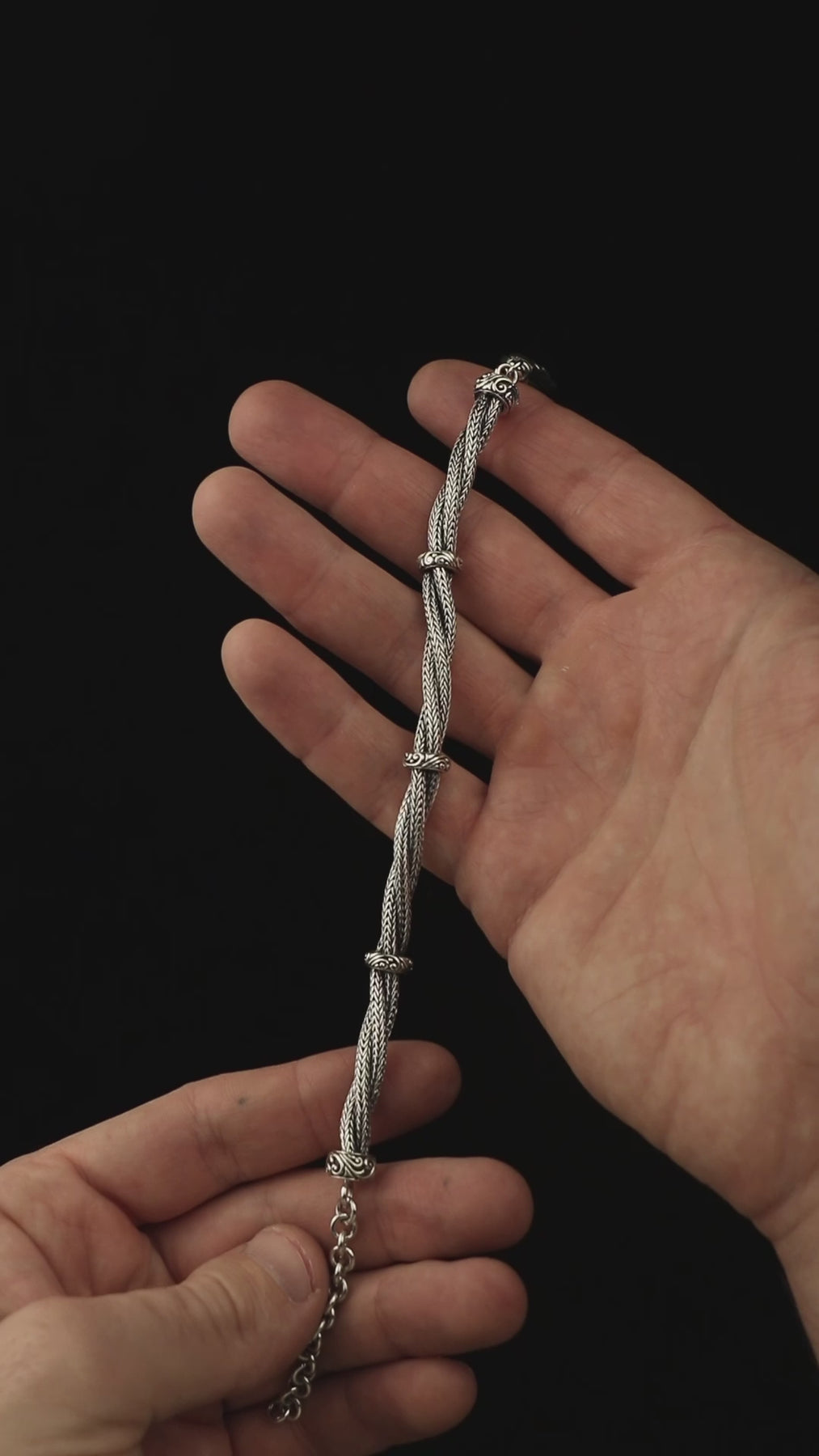 Handcrafted from solid 925 Sterling Silver, The Vortex embodies motion, balance, and refinement. Its intricate woven links twist fluidly around the wrist, while sculpted silver rings create rhythm and contrast within the design. Every detail is brought to life through expert hand-finishing and a deep oxidized polish that reveals its complex structure.